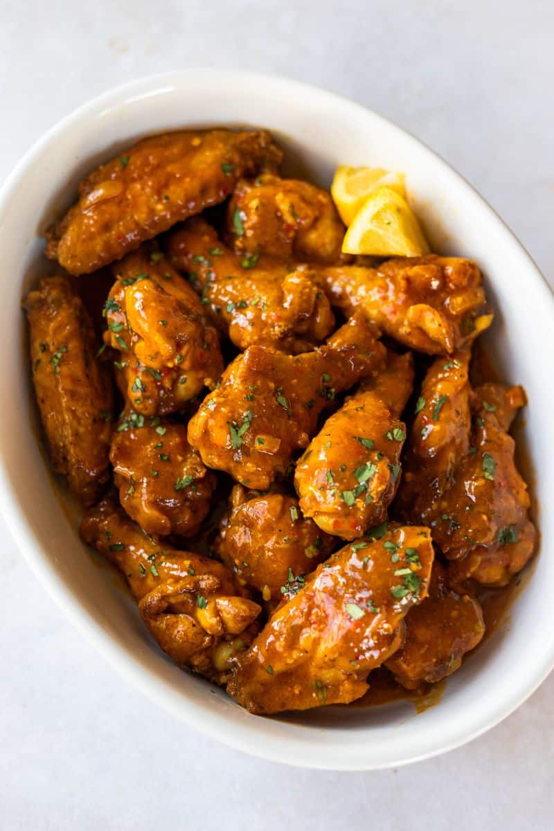 When you’re ready to reheat the wings, just place them on a foil or parchment-lined baking sheet and warm them in the oven at 350°F for 10-15 minutes, or until crispy. Leftover sauce can be reheated on the stove. Re-toss the wings in the sauce before serving.